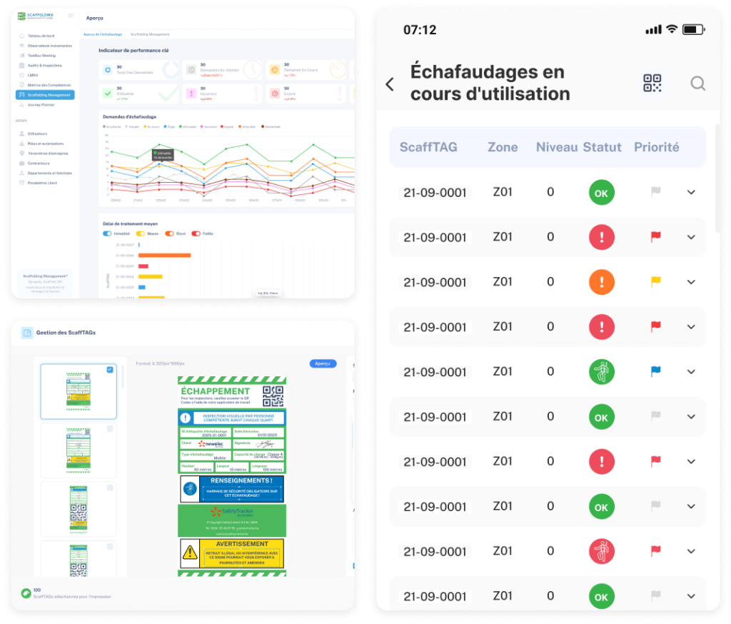 SCAFFOLDING® est un module de SafetyTracker® qui permet de gérer les échafaudages, de piloter leur conformité via un QRScafftag (vert/jaune/rouge) et application mobile, et de suivre l’ensemble du cycle de vie (demande, montage, réception, inspections utilisateurs et périodiques, modifications, démontage) afin de sécuriser les travaux en hauteur, améliorer la traçabilité terrain et réduire les risques et optimiser les coûts.
