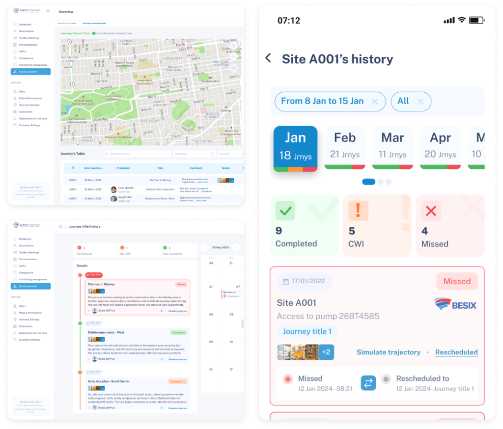 JourneyPlanner® permet aux coordinateurs, conseillers en prévention, superviseurs et techniciens de planifier efficacement leurs tournées de visites ou d’inspections directement depuis SafetyTracker®, sans recourir à un outil externe ni ressaisir les adresses. Les tournées peuvent être préparées par un collègue (planificateur, dispatcheur, superviseur ou secrétaire) et ajustées en temps réel selon les urgences, depuis l’interface web ou mobile.