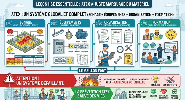 ATEX ≠ juste marquage du matériel : c’est un système global (zonage + équipements + organisation + formation). Une zone mal classée ou un équipement non ATEX = explosion potentielle. La prévention ATEX sauve des vies en rendant l’explosion impossible par conception.